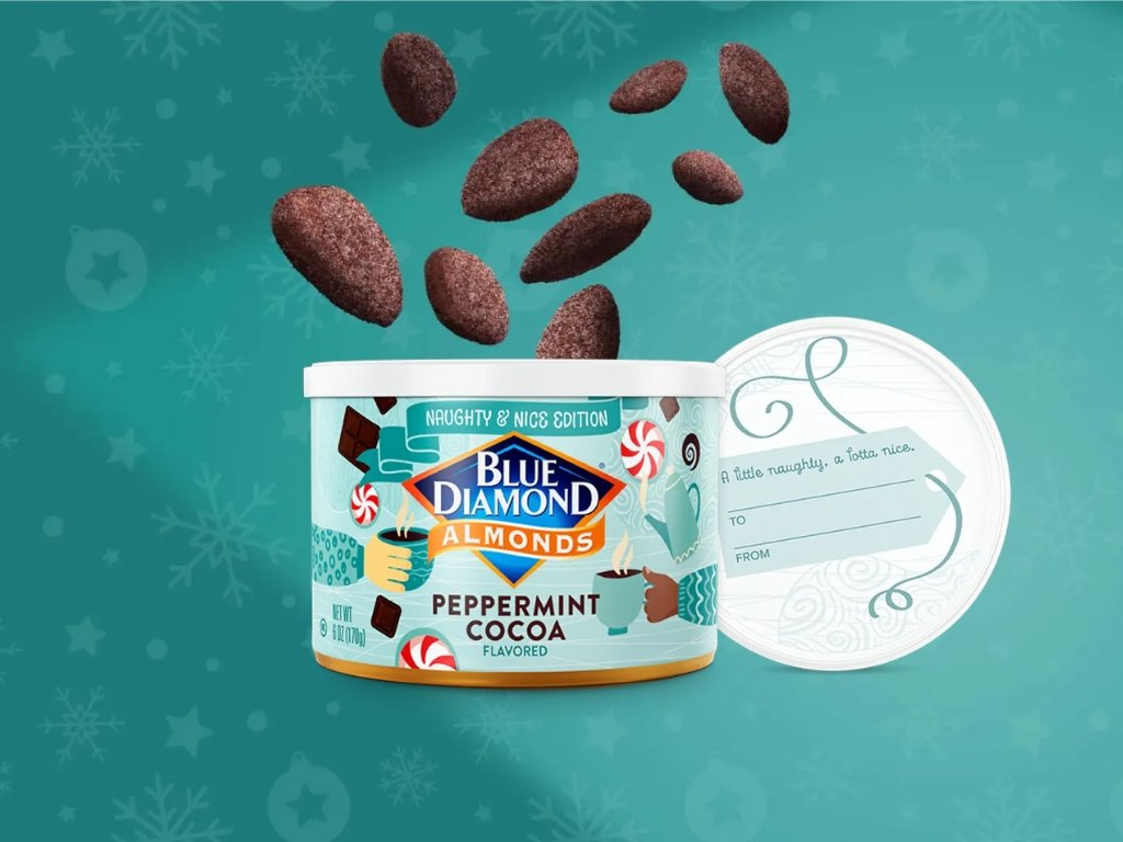 Sladké americké mandle v limitované vánoční edici Naughty & Nice. Blue Diamond Almonds Peppermint Cocoa přináší oblíbenou americkou vánoční příchuť máty a kakaa. Dárková plechová krabička s víčkem, které obsahuje prostor pro věnování. Darujte chutný a originální dárek z USA.