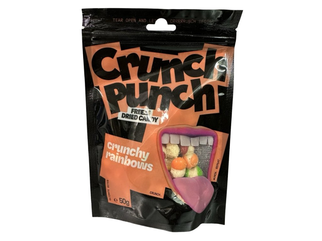 Rozzařte si den s Crunch Punch Crunchy Rainbows – mrazem sušenými bonbony, které promění každou chvíli v barevnou oslavu. Každá barva skrývá jinou ovocnou chuť, která díky sušení mrazem získala dokonalou intenzitu a křupavost. Výsledkem je jedinečný zážitek, který spojuje sladkost, lehkost a neodolatelnou hru barev.