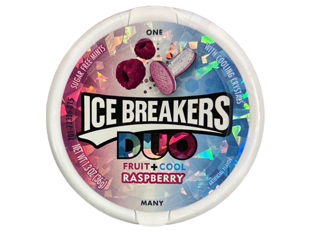 Chladivé bonbóny z USA Ice Breakers Duo Fruit + Cool Raspberry nabízí kombinaci mátového bonbónu z jedné strany a ovocné příchuti malin z té druhé. Ice Breakers Duo obsahují chladící krystalky a jsou bez cukru.