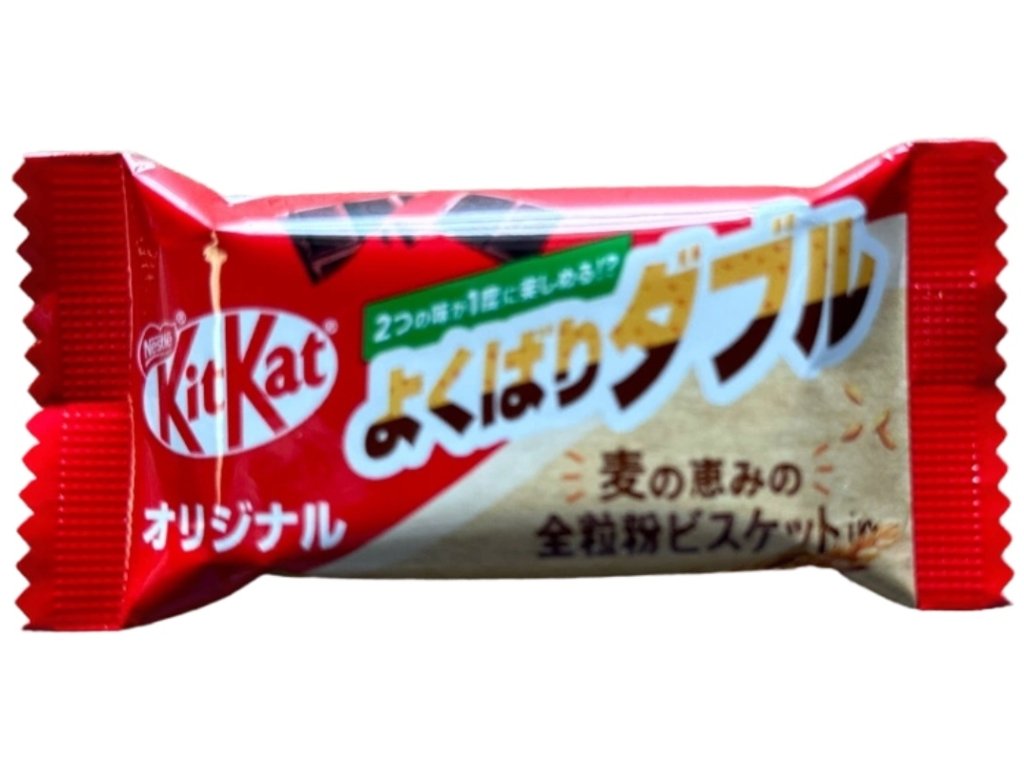 KitKat Mini Double Whole Grain Biscuit je varianta populárního čokoládového sušenky KitKat s dvojitou vrstvou celozrnného sušenkového těsta.