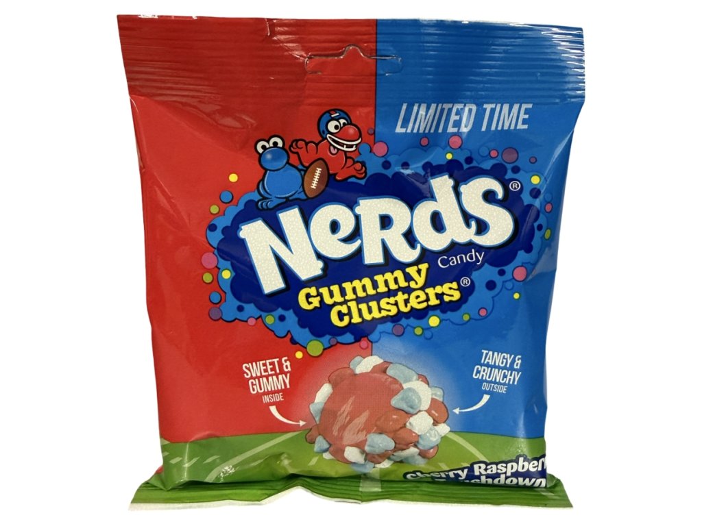 Nerds Gummy Clusters Cherry Raspberry Touchdown přinášejí intenzivní chuť třešně a maliny v dokonale vyvážené kombinaci sladkého a kyselého. Měkké želé je obalené křupavými Nerds bonbony, které dodávají každému soustu hravou strukturu. Tento produkt z USA je ideální pro milovníky ovocných a výraznějších chutí.