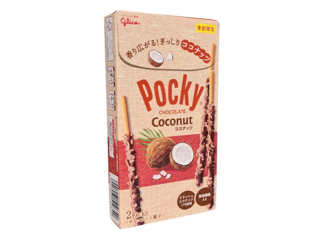 Populární japonské tyčinky Pocky v limitované exotické edici Chocolate Coconut. Lahodná mléčná čokoláda s kousky kokosu na klasické Pocky preclíkové tyčince. Tato limitované edice je balena po dvou sáčcích v jedné krabičce.