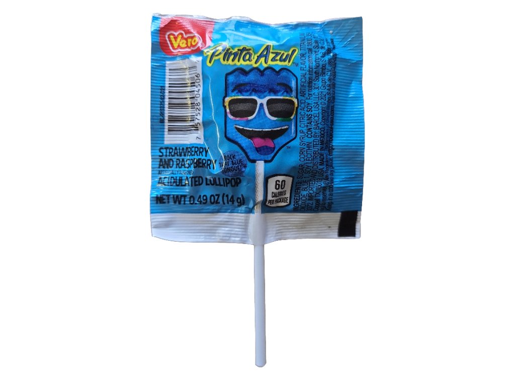 Lízátko "Pinta Azul" od známé značky Vero je lahodné tvrdé lízátko ve tvaru štětce zbarvené do eletricky modrých odstínů a ochucené ovocnými a sladkými esencemi malin a jahod.